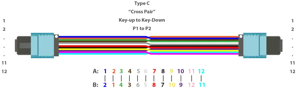 Type B trunks reverse the fiber mapping: fiber 1 → fiber 12, fiber 2 → fiber 11, etc. This is typically used for direct transceiver-to-transceiver links.