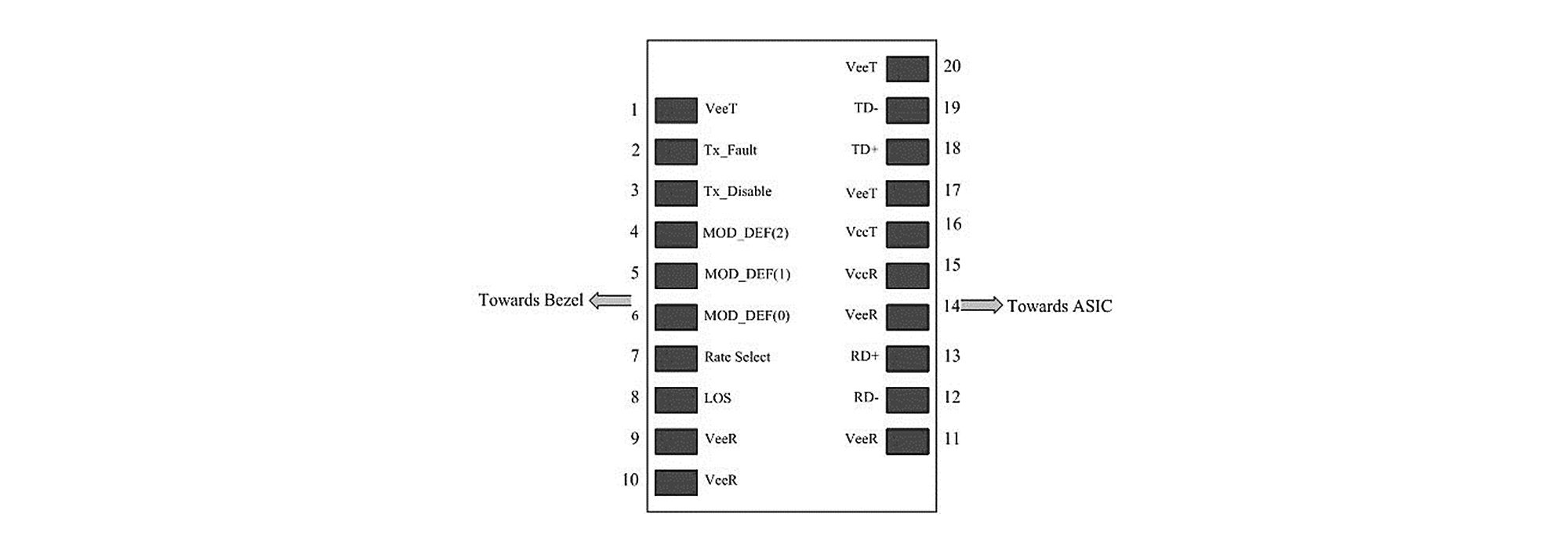 | Notes: Note1: TX disable is an input that is used to shut down the transmitter optical output. It is pulled up within the module with a 4.7–10KΩ resistor. Its states are: Low (0–0.8V): Transmitter on (>0.8, < 2.0V): Undefined High (2.0 – 3.465V): Transmitter DisabledNote2: Mod-Def 0,1,2. These are the module definition pins. They should be pulled up with a 4.7K–10KΩ resistor on the host board. The pull-up voltage shall be VccT or VccR. Mod-Def 0 is grounded by the module to indicate that the module is present. Mod-Def 1 is the clock line of two wire serial interface for serial ID. Mod-Def 2 is the data line of two wire serial interface for serial ID. |
