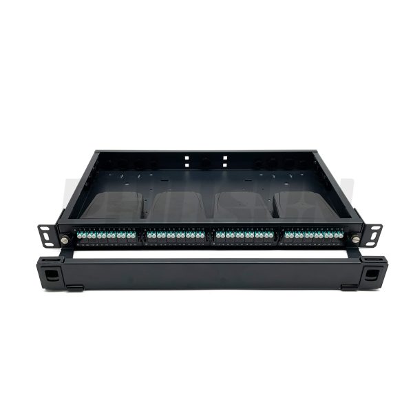 MPO 1U Rack Mount Fiber Patch Panel with 4 Plastic Cassettes(4pcs of 12 Fibers MPO to LC Fiber Patch Cord), 48 Fibers, Fixed Type