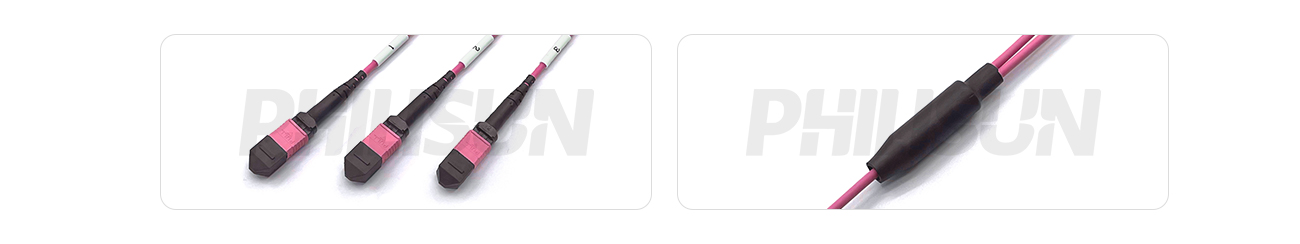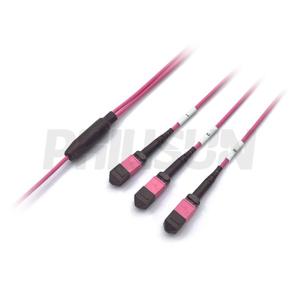 MPO Breakout Cable, 2 x MPO-12 PC/APC(Female/Male) to 3 x MPO-8 PC/APC(Female/Male), 24 Fibers, Multimode(OM4),0.35dB Max, Aqua/Violet
