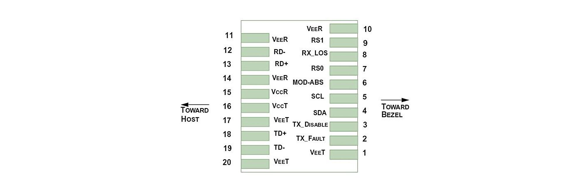 | 4 | SDA | Module definition identifiers | Serial ID with SFF 8472 diagnostics module definition pins should be pulled up to Host Vcc with 10 kΩ resistors. | ||||||