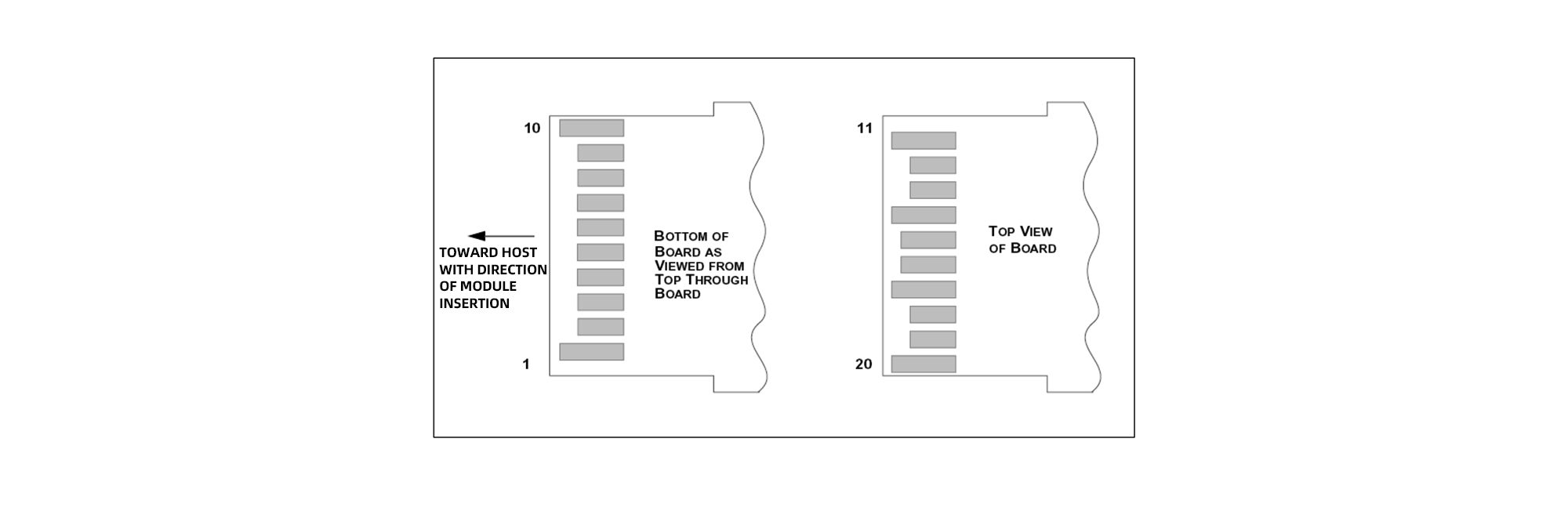| 4 | SDA | Module definition identifiers | Serial ID with S FF 8472 diagnostics module Definition pins should be pulled up to Host Vcc with 10kΩ resistors. | ||||||