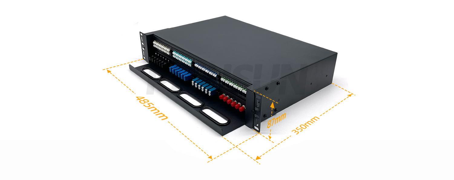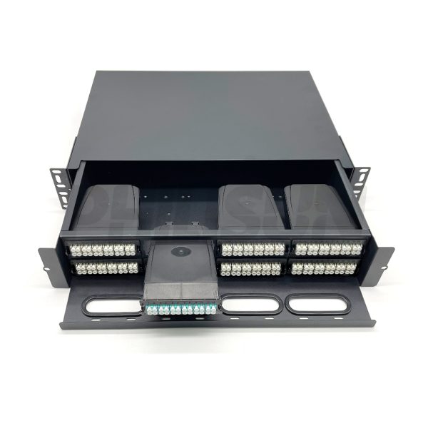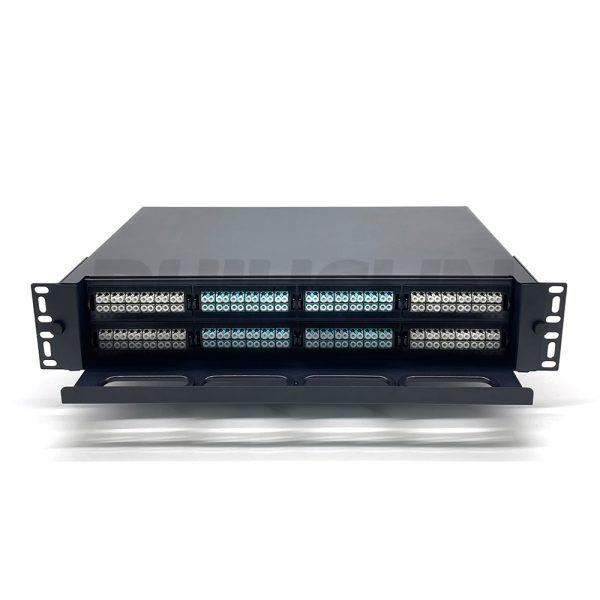 This 2U Sliding MPO Patch Panel is the ultra-density backbone consolidation unit, achieving a massive 192-fiber capacity from eight MPO-24 inputs. This configuration is crucial for core-to-distribution layer aggregation, supporting 96 dual-fiber channels or an impressive 192 single-fiber bidirectional channels. The sliding chassis ensures all connections are readily accessible, simplifying the deployment and long-term management of high-count MPO trunks into individual LC service ports in large enterprise data centers.