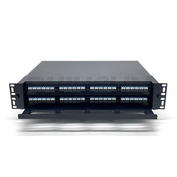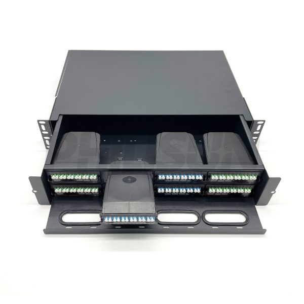This 2U Sliding MPO Patch Panel is engineered for high-capacity aggregation, utilizing eight 12-fiber cassettes to deliver 96 active LC ports. The 2U chassis provides ample space for cable routing and slack management, essential for clean, high-density installations. It expertly supports 48 dual-fiber channels or 96 high-speed single-fiber bidirectional channels via eight MPO-12 connections. The ergonomic sliding access allows network engineers to perform maintenance and patching quickly and safely, minimizing service disruption in live environments.