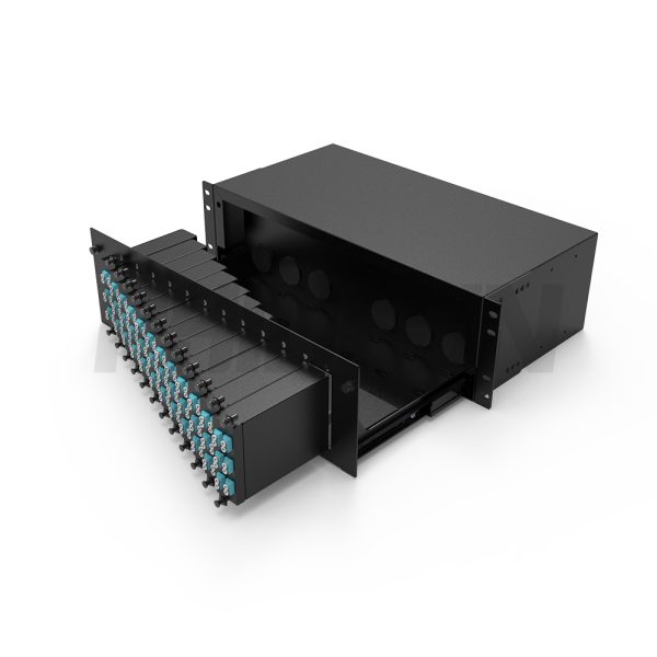 MPO 3U Rack Mount Fiber Patch Panel with 12 Metal Cassettes(12pcs of 12 Fibers MPO to LC Fiber Patch Cord), 144 Fibers, Sliding Type