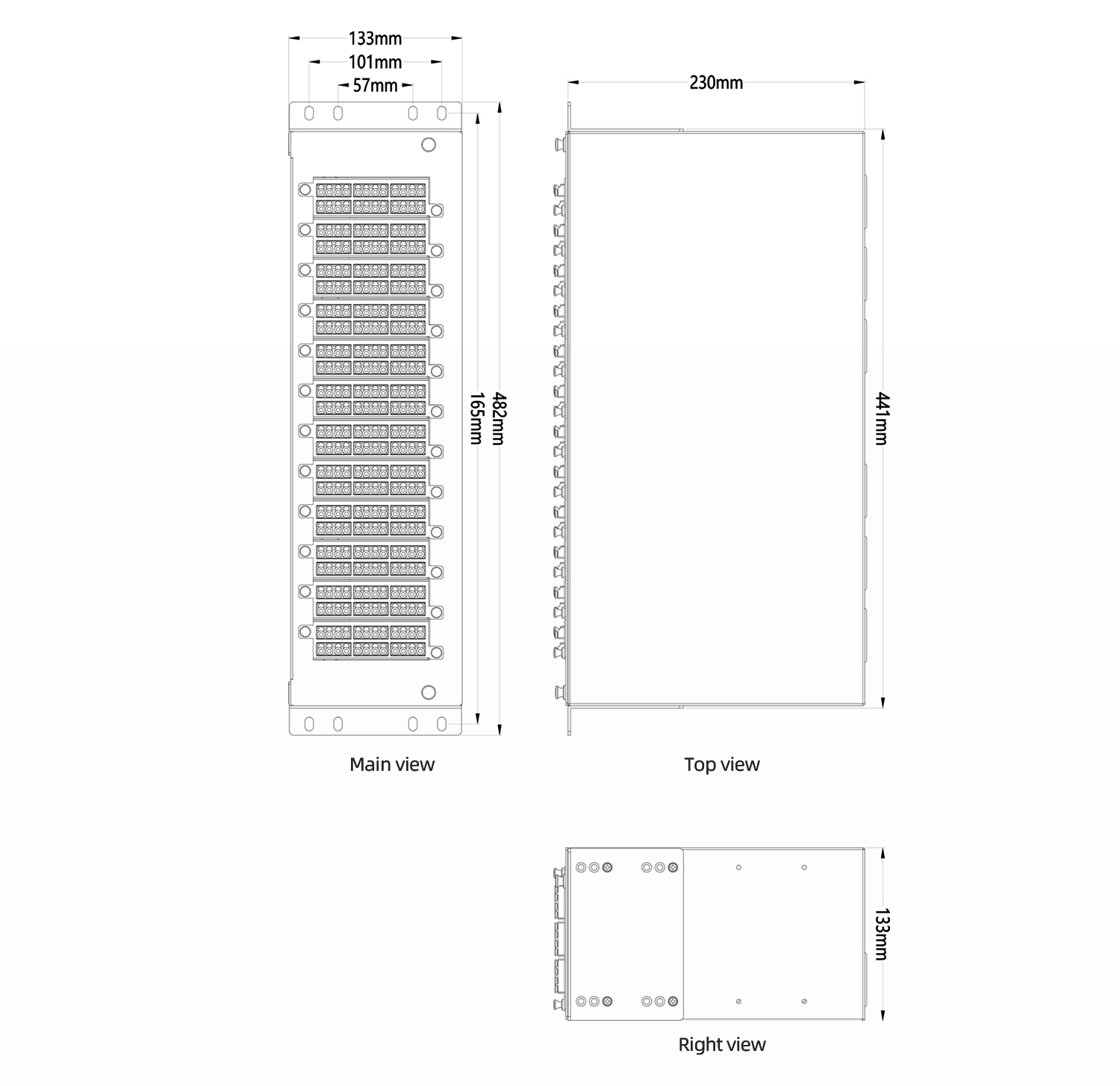| There are six 30mm cable inlets and cable coiling spaces in the rear of patch panel.According to the dust rubber ring can be cut into the cable and coiled and fixed as required. | The mounting holes of the chassis mounting ears are adjustable to meet the actual wiring requirements of the user. | Using high quality cold rolled steel plate molding, pressure and impact resistance. Electrostatic spraying, uniform and flat, wear-resistant and anticorrosion, beautiful appearance. |