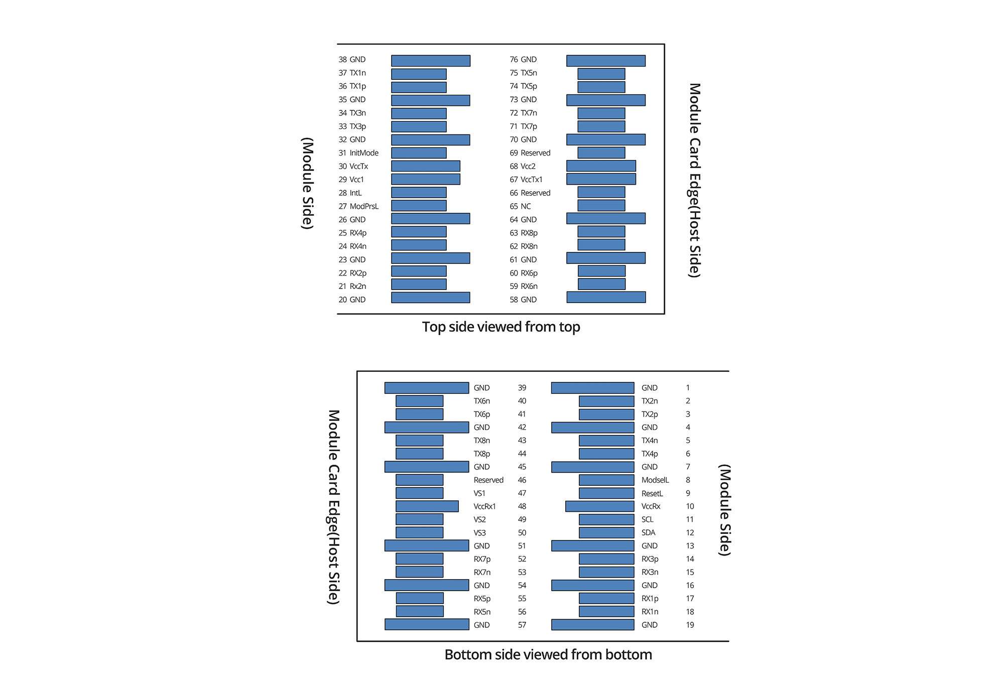 Note 2. VCCRx, VCCRx1, VCC1, VCC2, VCCTx, and VCCTx1 shall be applied concurrently. Requirements defined for the host side of the Host Card Edge Connector are listed in Table 4. VCCRx, VCCRx1, VCC1, VCC2, VCCTx, and VCCTx1 may be internally connected within the module in any combination. The connector Vcc pins are each rated for a maximum current of 1000mA. Note 3. All Vendor Specific, Reserved and No Connect pins may be terminated with 50 ohms to ground on the host. Pad 65 (No Connect) shall be left unconnected within the module. Vendor Specific and Reserved pads shall have an impedance to GND that is greater than 10 kOhms and less than 100pF. |