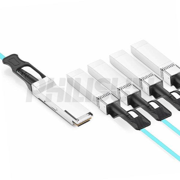 The PHILISUN 40G QSFP+ to 4×10G SFP+ Active Optical Breakout Cable is a direct-attach fiber assembly designed for linking 40G devices to 10G devices. The product complies with SFF-8436, SFF-8431, and MSA standards and is suitable for heterogeneous connections across adjacent racks. It uses OM3 Multimode Fiber. Its compact structure and fully sealed integrated optics reduce costs compared to conventional optical modules and jumpers, while significantly improving reliability and reducing maintenance. This AOC guarantees broad compatibility with major vendor platforms including Cisco, H3C, Huawei, Juniper, and Arista, and more.