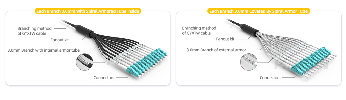 | Branch Type | Round Tube/Armored Tube | Fiber Loss | SM:0.35db@1310nm/0.2dB@1550nm MM:2.4dB@850nm/0.6dB@1300nm |