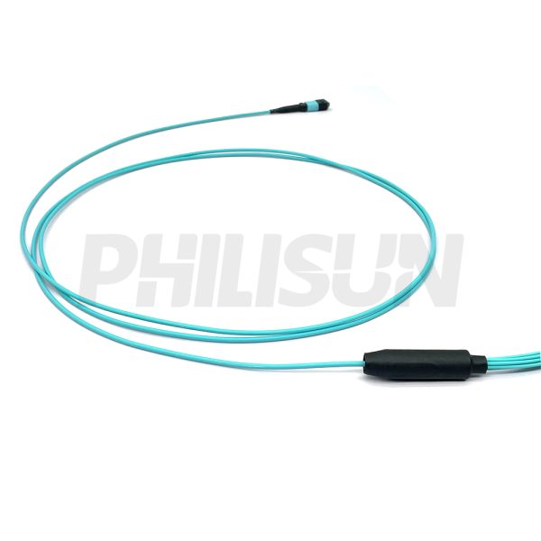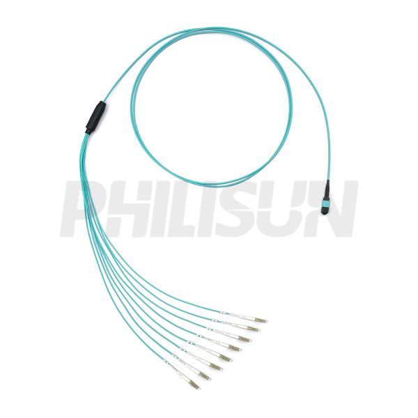 MPO Harness Cable, MPO-8 PC/APC(Female/Male) to LC PC/APC, 8 Fibers, Multimode(OM3), 0.35dB Max, Type A/AF/B/U, Aqua