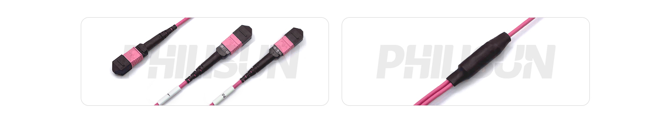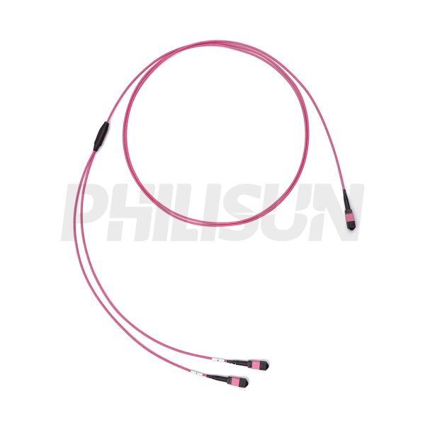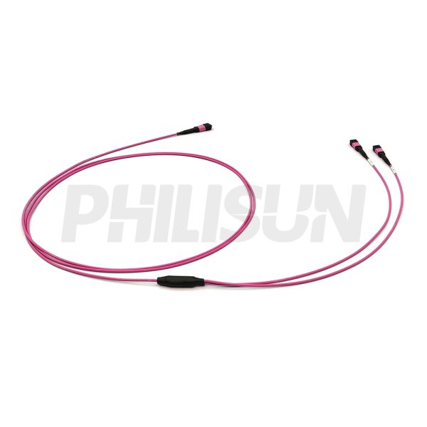 MPO Breakout Cable, MPO-8 PC/APC(Female/Male) to 2 x MPO-4 PC/APC(Female/Male), 8 Fibers, Multimode(OM4),0.35dB Max, Aqua/Violet