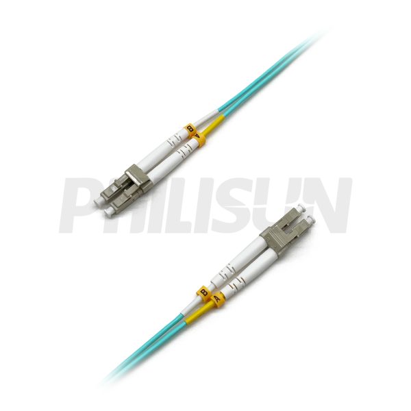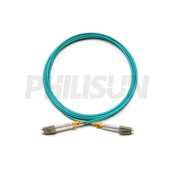 Fiber Optic Patch Cable, 2 Fibers, LC UPC Duplex to LC UPC Duplex, OM3 Multimode, Aqua