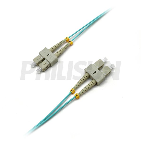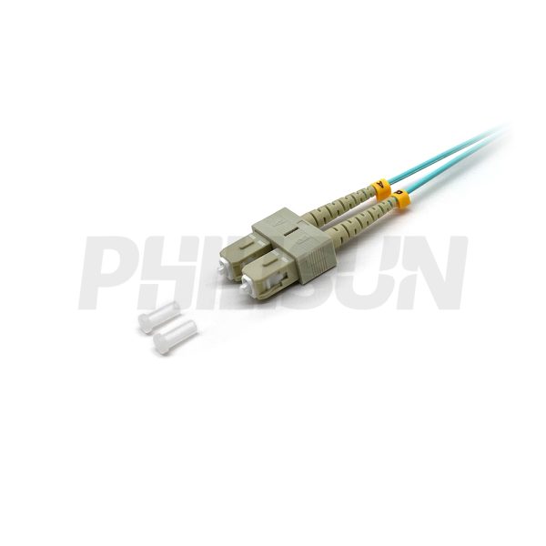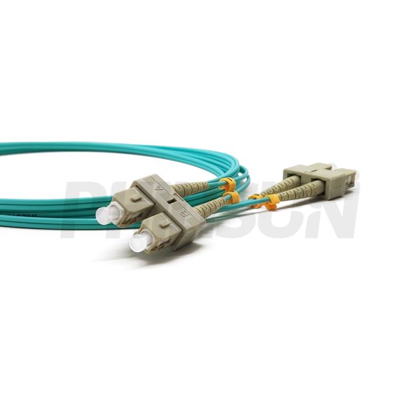 Fiber Optic Patch Cable, 2 Fibers, SC UPC Duplex to SC UPC Duplex, OM3 Multimode, Aqua