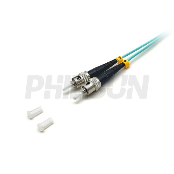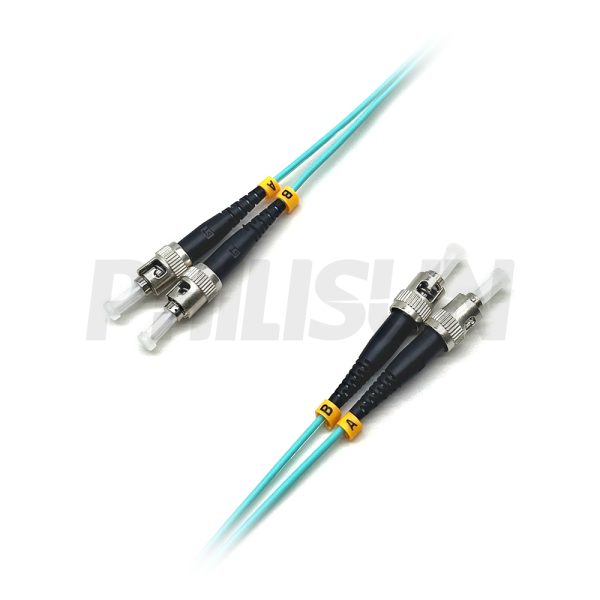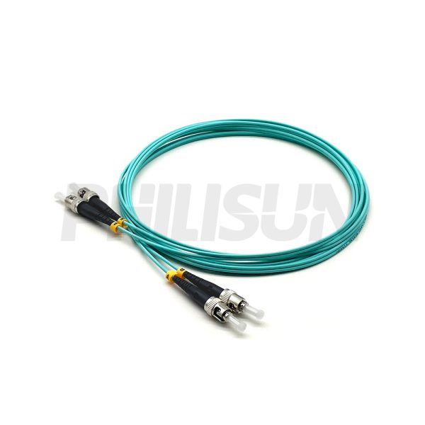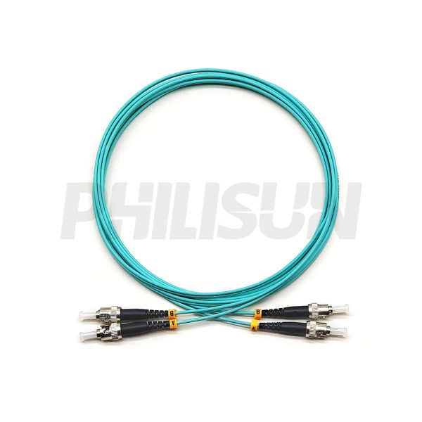 Fiber Optic Patch Cable, 2 Fibers, ST UPC Duplex to ST UPC Duplex, OM3 Multimode, Aqua