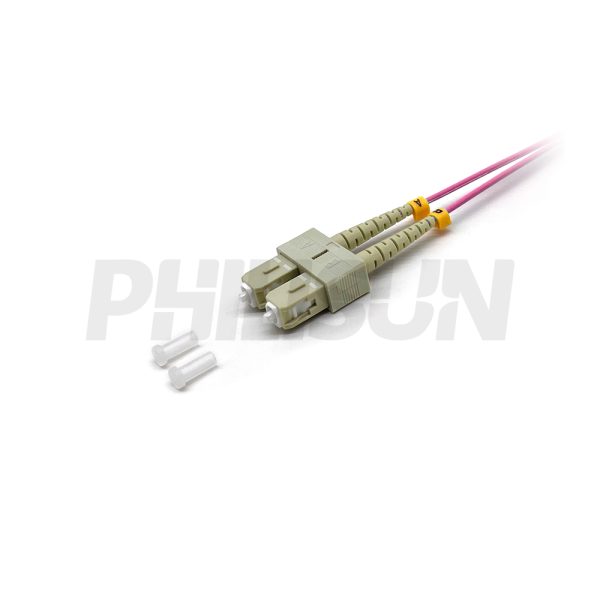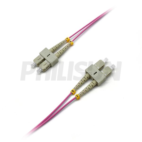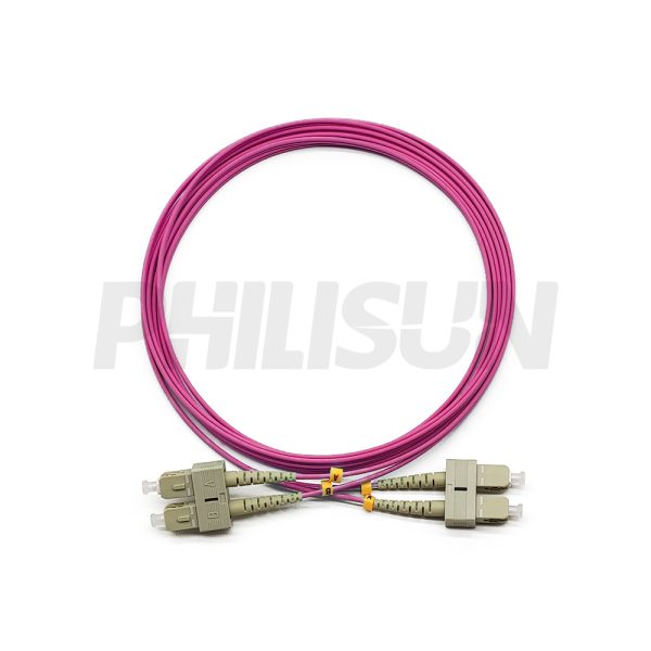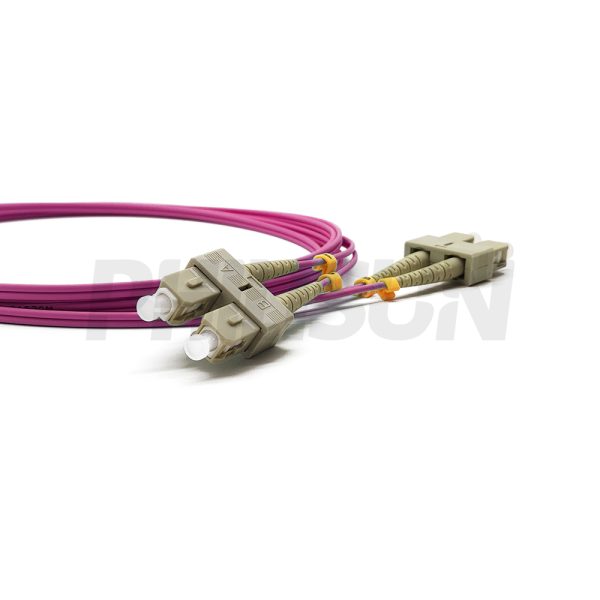 Fiber Optic Patch Cable, 2 Fibers, SC UPC Duplex to SC UPC Duplex, OM4 Multimode, Aqua/Violet