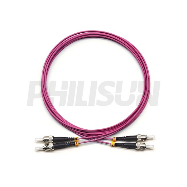 Fiber Optic Patch Cable, 2 Fibers, ST UPC Duplex to ST UPC Duplex, OM4 Multimode, Aqua/Violet