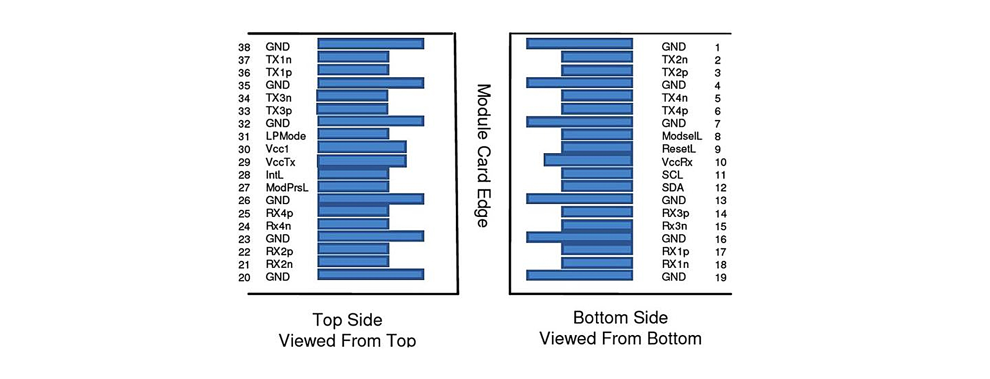 | Notes: 1. GND is the symbol for signal and supply (power) common for the QSFP+ module. All are common within the QSFP+ module and all module voltages are referenced to this potential unless otherwise noted. Connect these directly to the host board signal-common ground plane. 2.Vcc Rx, Vcc1 and VccTx are the receiver and transmitter power supplies and shall be applied concurrently. Vcc Rx Vcc1 and VccTx may be internally connected with- in the QSFP+ Module module in any combination. The connector pins are each rated for a maximum current of 500 mA. |