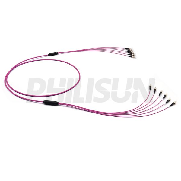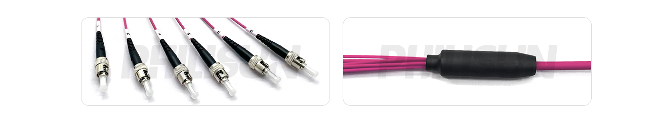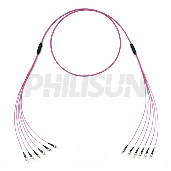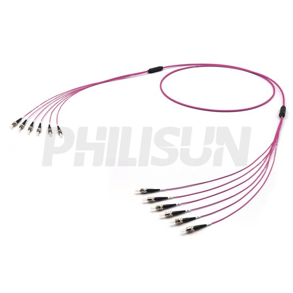 Indoor Pre-terminated ST Multi Mode OM4 Multi-fiber Breakout Cable is a cost-effective, pre-assembled cable primarily designed for indoor interconnection between transmission equipment and patch panels or other similar fixed routing applications. This fiber optic cable features an industry-standard flame-retardant jacket, and its connectors comply with EIA/TIA 604-4 standards, making it suitable for high-speed cabling networks.