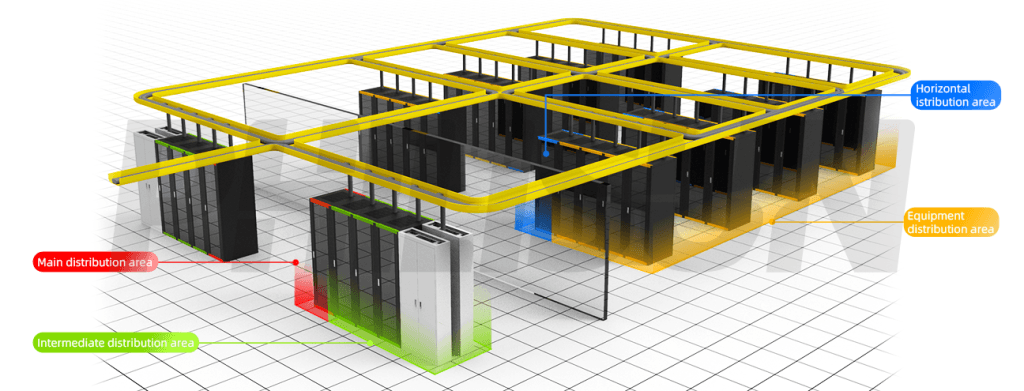The data center is divided into multiple distribution areas at different levels: main distribution area (MDA), intermediate distribution area (IDA), horizontal distribution area (HDA); zone distribution area (ZDA), equipment distribution area (EDA)