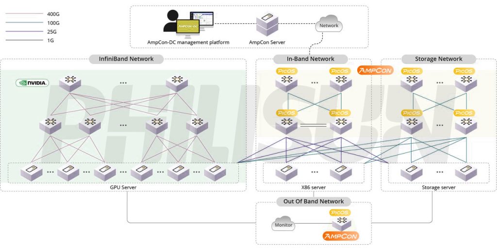 PHILISUN A next-generation network architecture specifically designed for high-performance computing (HPC) and artificial intelligence (AI), combining the powerful computing capabilities of NVIDIA H100 GPUs with the ultra-low latency communication of InfiniBand, enabling intelligent and automated network management through PicOS® software and the AmpCon-DC management platform.